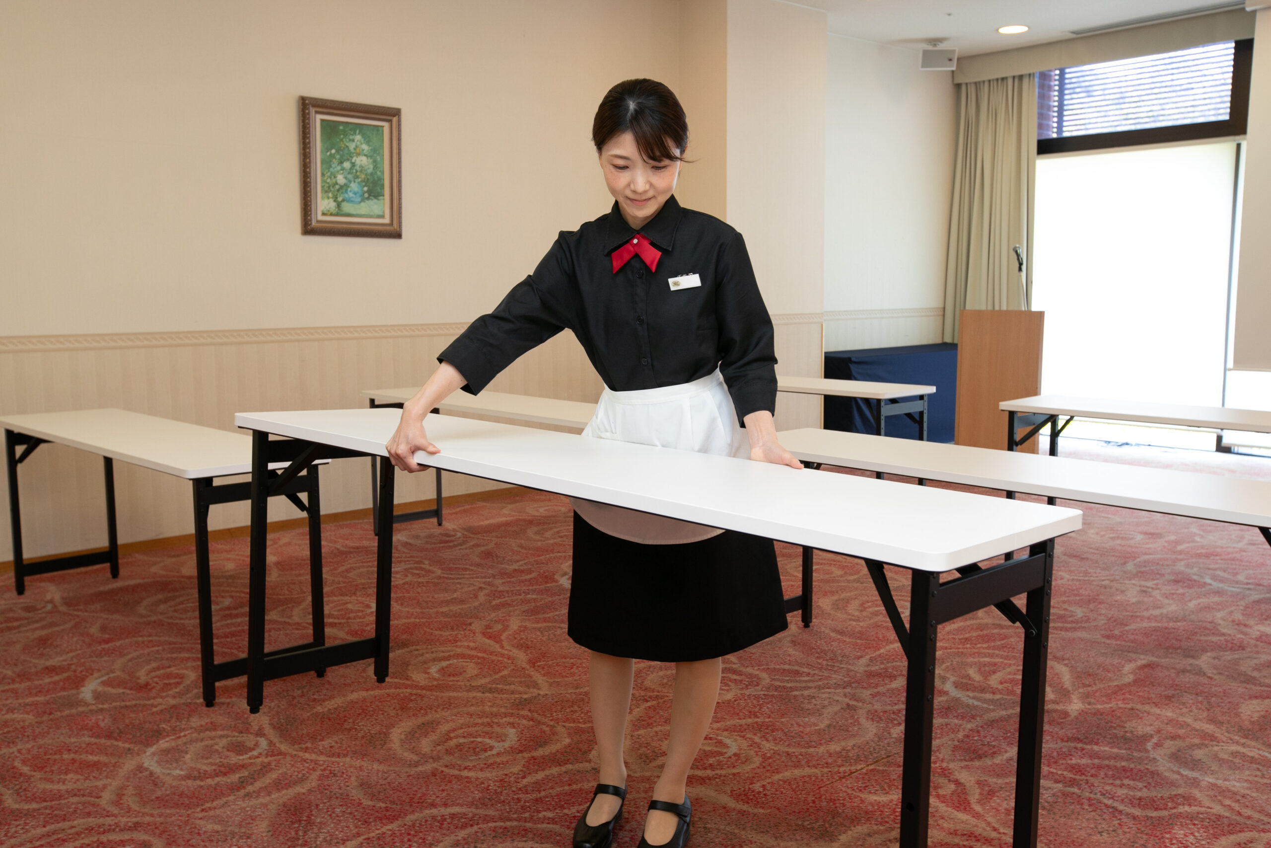 シンプルなデザインが空間に馴染み、薄型設計により立てたまま省スペースで収納できるため、リネンコストの削減や会場設営のスピード向上にもつながりました。