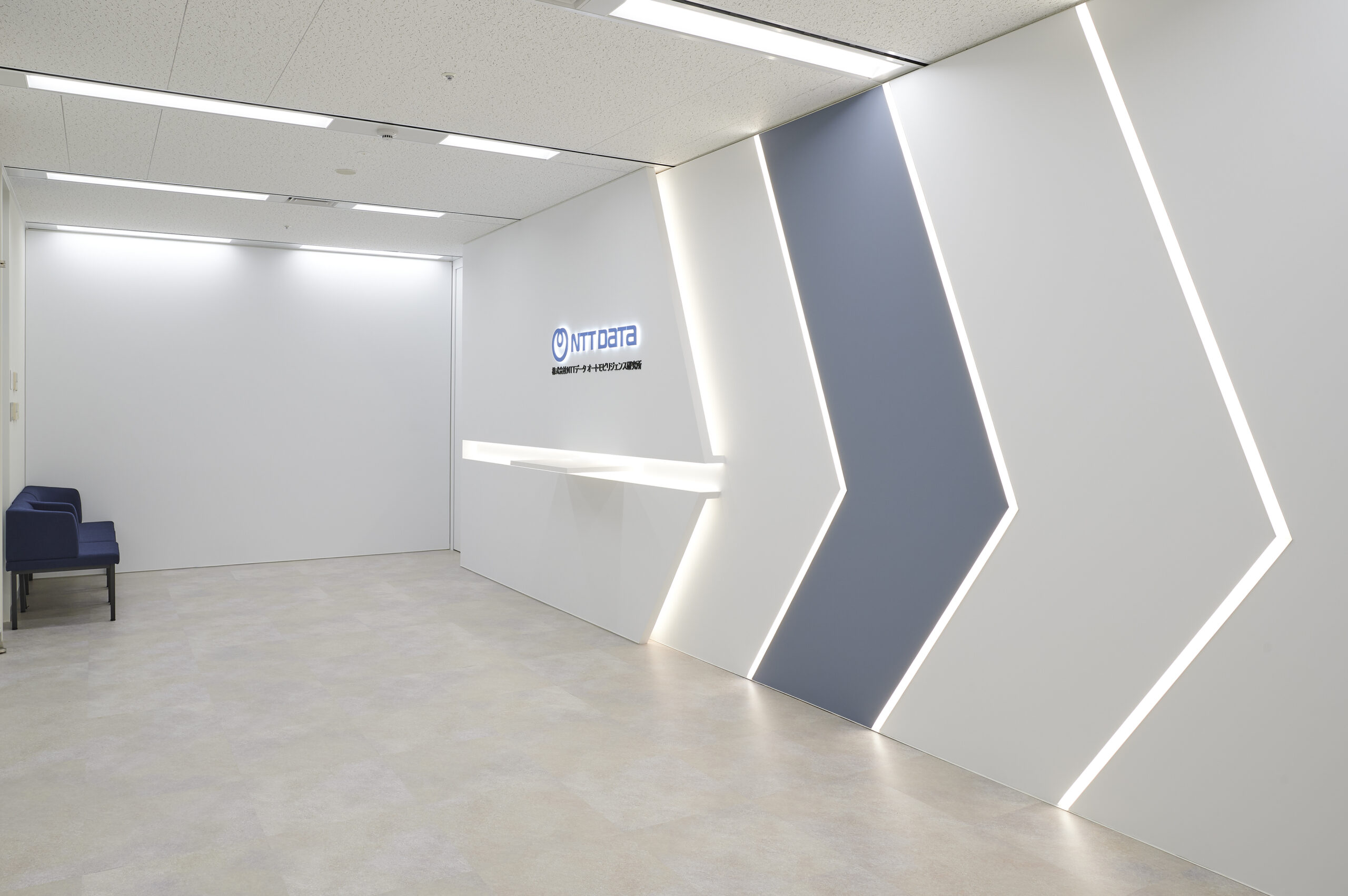 会社の顔となるエントランスは、「近未来」「無機質」というキーワードをもとに、矢印をモチーフとしたデザインとし、自動車を扱う企業らしさと先進性を表現しました。
