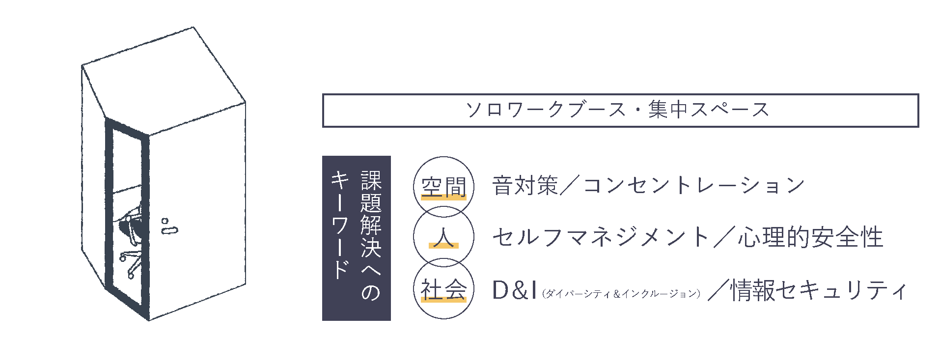 自分に向き合い、集中から生まれるひらめきを再発見できるエリア。音対策を施したスペースを設け、Web会議や個人ワークにも最適な環境を整えます。高い集中を実現し、一人での作業に没頭しながらも、必要な場面でスムーズに外とつながることができる空間です。