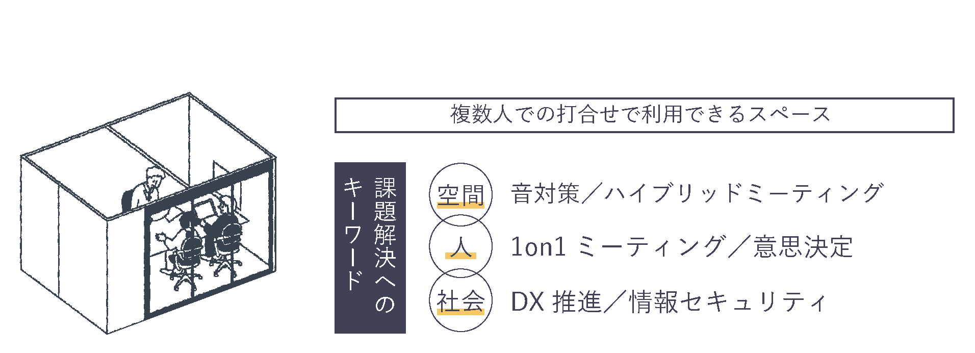 意見交換から新たな発想や気づきを再発見できる意思決定の場。音や視線に配慮したミーティングブースを設け、打合せや1on1に集中できる環境を整えます。対話を通じて多様な考えが交わり、個々のアイデアが結びつくことで、新しい発想が生まれる場です。