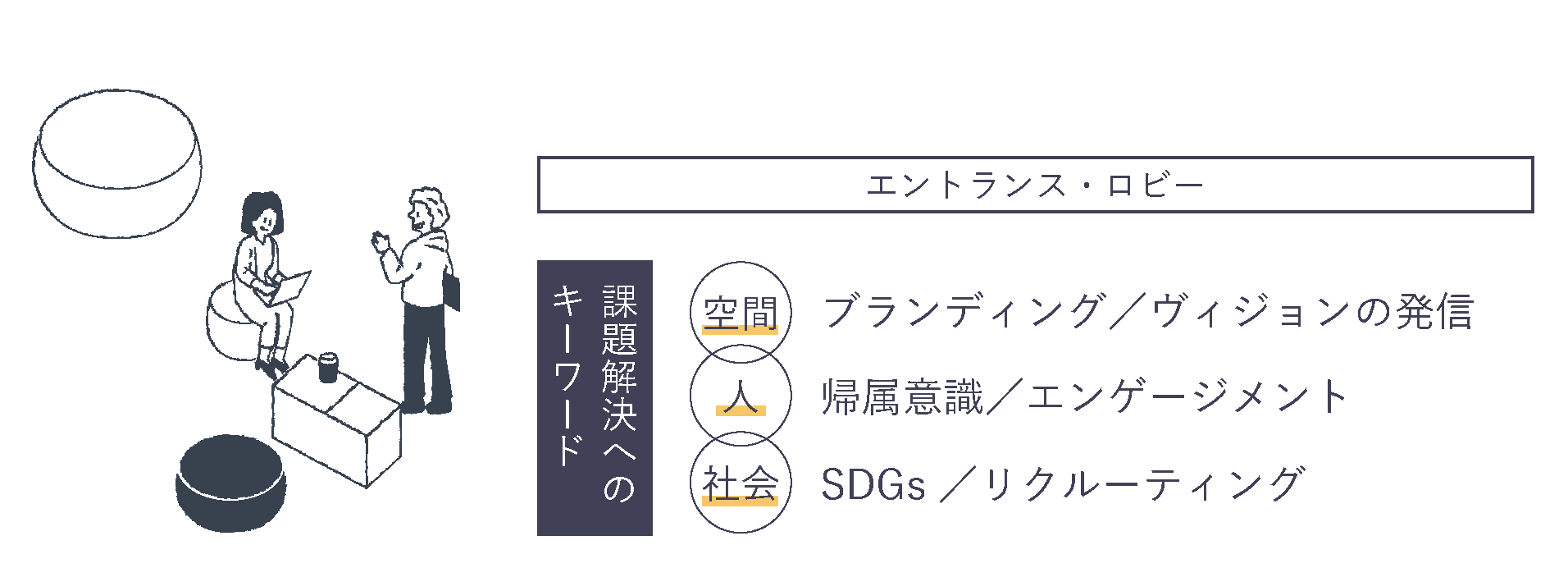 企業の“らしさ”をかたちにして、働く人や来訪者に発信する場と定義しています。 社員のエンゲージメントを高め、リクルーティングやブランディングに活かすとともに、 SDGsをはじめとした社会的な取り組みも発信し、会社の価値を再発見できる場です。