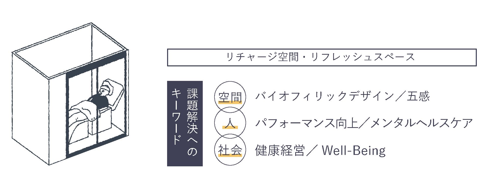 パフォーマンスを発揮するためのリチャージ空間。心身を整えるリフレッシュの仕掛けや、メンタルヘルスに寄り添う工夫を取り入れながら、Well-Beingを高める空間をデザインします。健康経営の視点からも、働く人一人ひとりの健やかさを支える場です。
